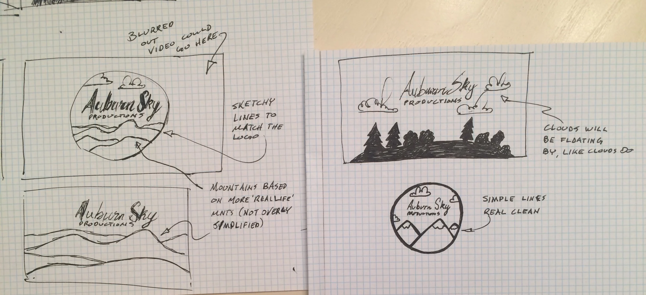 Through sketches (not all sketches are shown... there were a lot), I explored different directions we could go for "cresting over a hill for a big reveal." After discussions with John, we determined that a full screen scene would give the big reveal more impact.